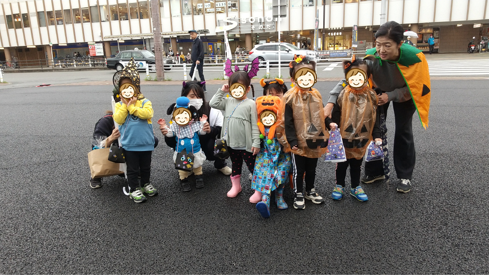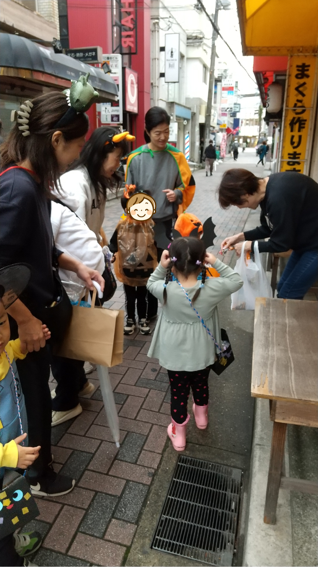 今年のハロウィンはあいにくの雨だったので、全員で一斉にではなく、時間を分けてお店を回ることにしました。