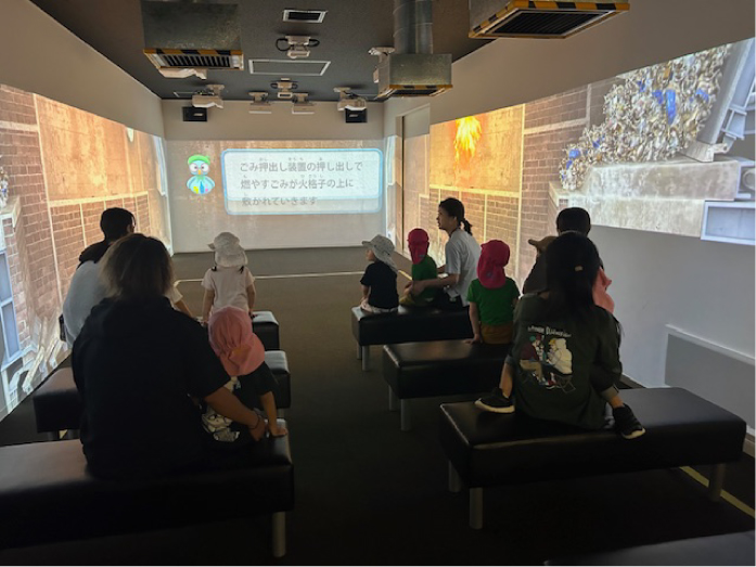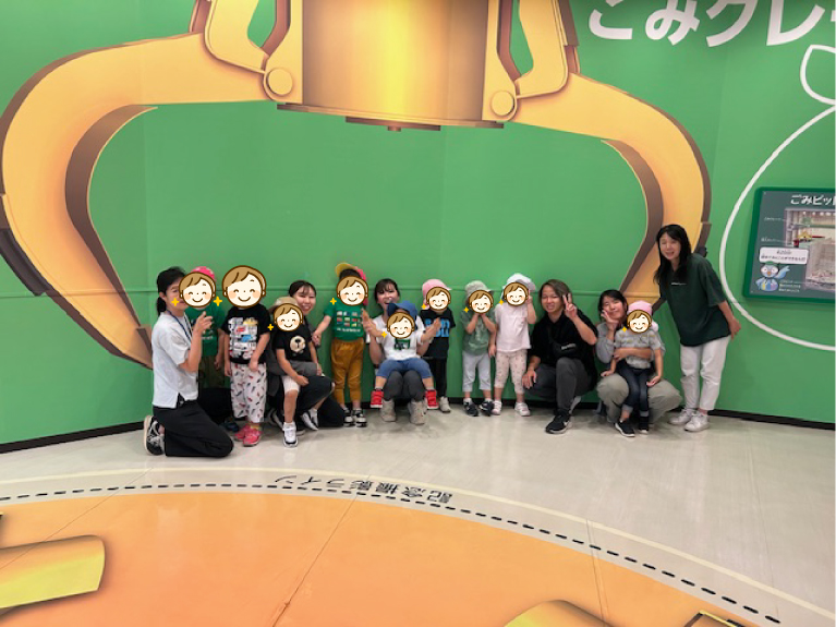ごみ処理場の見学に行きました。新しくできたごみ処理場で、大きな建物の中を丁寧に案内してくださいましたよ。ごみを掴む大きなアームやビン缶の分別の様子、焼却炉内の様子を体感できるプロジェクションマッピングなど様々な体験ができ、子どもたちは驚きと発見がたくさんあったと思います。
