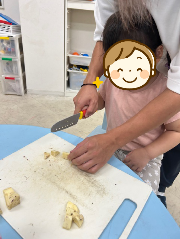 お芋を切ったり茹でて潰して混ぜたり、こねて形を作ったり・・・食べることが大好きな子どもたちは積極的にお手伝いしてくれ、おいしいスイートポテトにして頂きました。